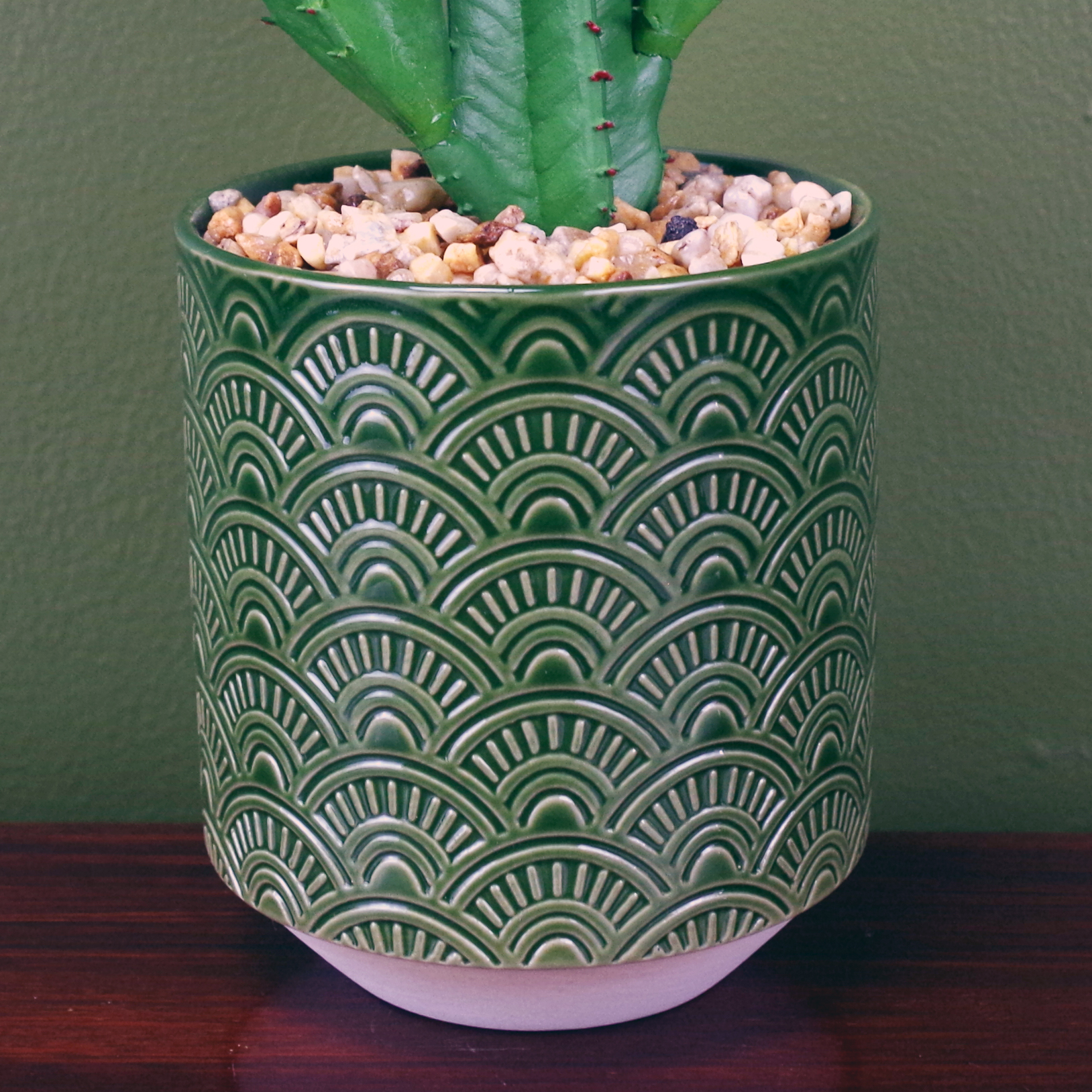 23cm artificial cactus plant potted in green ceramic planter. Plastic artificial cactus plant in a decorative green ceramic planter. These have little plastic needles on them but unlike the real thing these don’t get painfully embedded in your fingers. Fixed arrangement measuring 23cm x 9cm x 9cm overall. The decorative ceramic planter measures 10cm (h) x 9cm (w). The ceramic decorative planter is topped with fixed pebbles for an attractive, low maintenance finish.