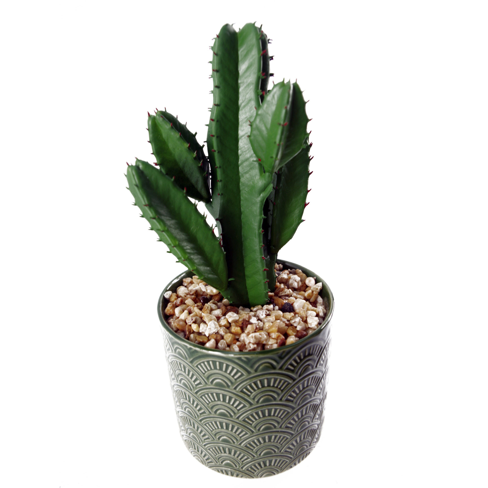 Plastic artificial cactus plant in a decorative green ceramic planter. These have little plastic needles on them but unlike the real thing these don’t get painfully embedded in your fingers. Fixed arrangement measuring 23cm x 9cm x 9cm overall. The decorative ceramic planter measures 10cm (h) x 9cm (w). The ceramic decorative planter is topped with fixed pebbles for an attractive, low maintenance finish.