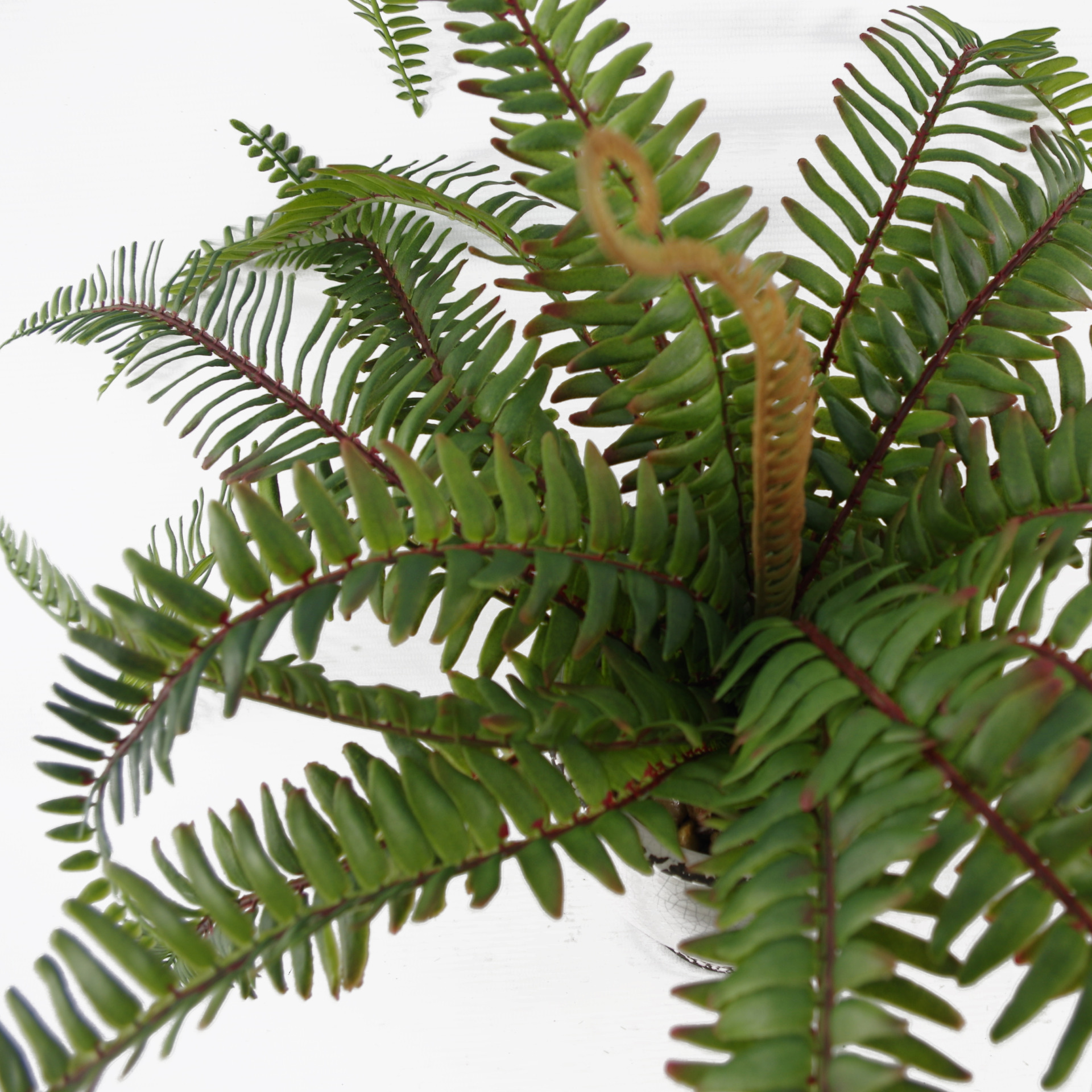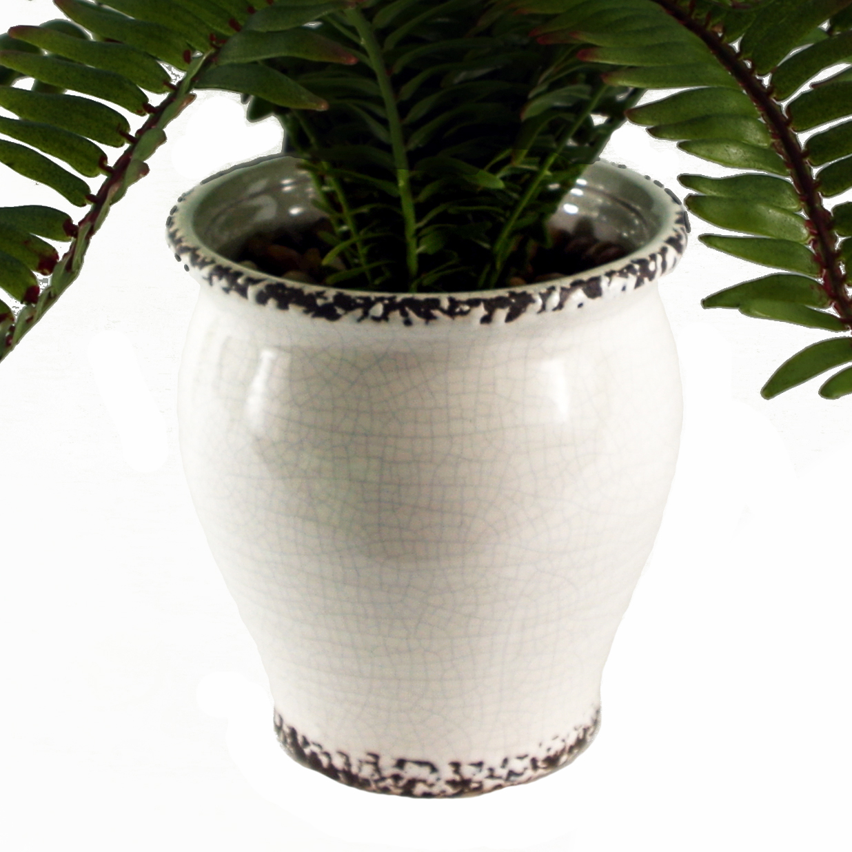 Highly realistic palm in a decorative ceramic vase planter, ready to display straight out of the box. Thick dense leaves with individually shaped fronds. The stems are wired and the leaves can be shaped to fit your space. As we have the fern arranged in our photos it measures 40cm x 60cm x 60cm. The decorative grey plastic planter measures 14cm (h) x 13cm (w). The leaves are plastic. The ceramic decorative planter is topped with fixed pebbles for an attractive, low maintenance finish.