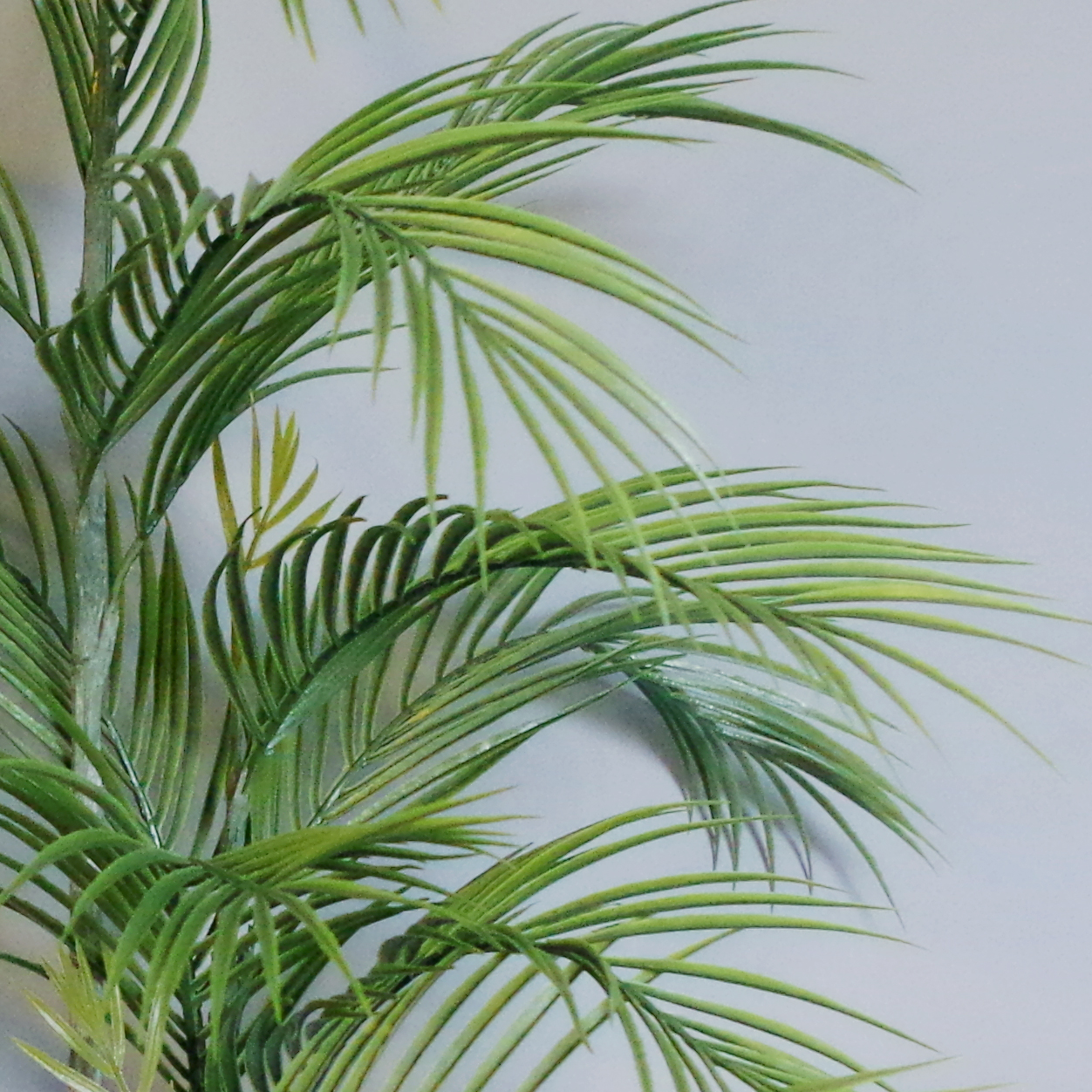 90cm artificial palm tree potted in decorative planter. A gorgeous artificial palm in a decorative plastic planter, ready to display staight out of the box. 14 large leaves and four small leaves. The stems are wired and the leaves can be shaped to fit your space. As we have the palm arranged in our photos it measures 90cm x 70cm x 50cm. The decorative grey plastic planter measures 15cm (h) x 15cm (w). The leaves are plastic. The decorative planter is topped with fixed pebbles for an attractive, low maintenance finish.